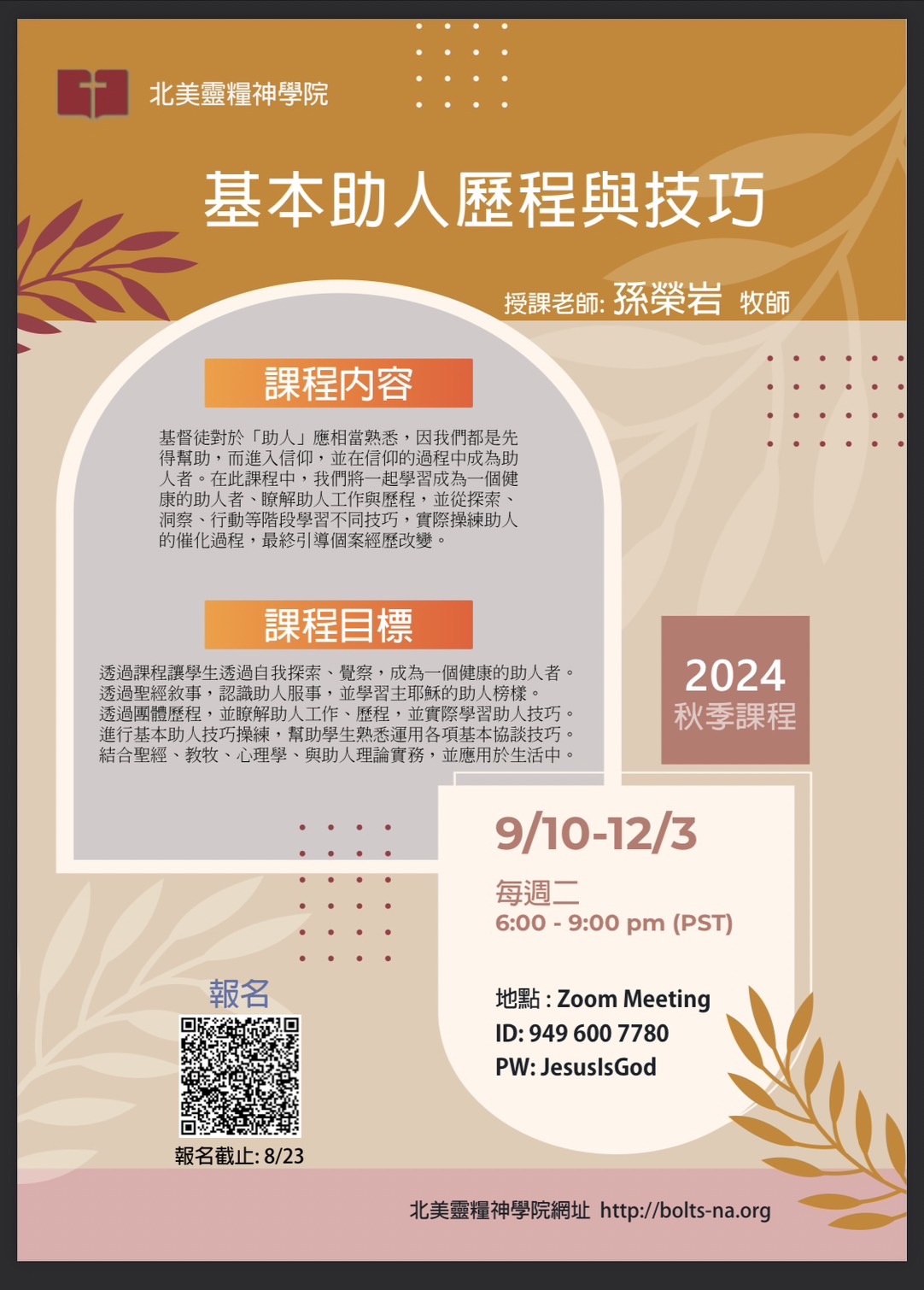 基督徒對於「助人」應相當熟悉,因我們都是先得幫助,而進入信仰,並在信仰的過程中成為助人者。在此課程中,我們將一起學習成為一個健康的助人者、瞭解助人工作與歷程,並從探索、洞察、行動等階段學習不同技巧,實際操練助人的催化過程,最終引導個案經歷改變。